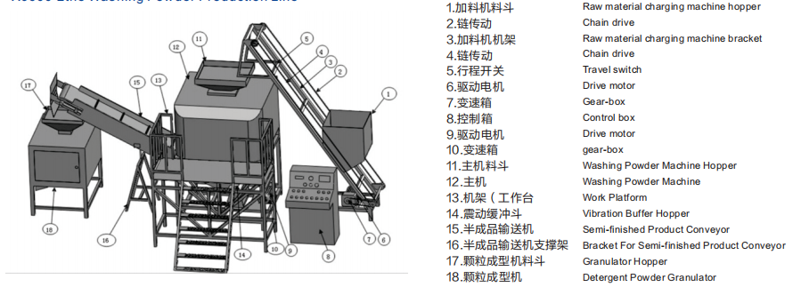 粉體自動加料機,主機,主機緩沖斗,主機支架,顆粒機支架,自動控制柜A,自動控制柜B,半成品輸送機,氣動自動排料機,成品輸料塔,KL雙輥顆粒成型機,振動儲料塔,自動控制閥,工作平臺,半成品老化塔支架,成品輸料機支架,振動儲料塔支架。以下是生產(chǎn)線詳細(xì)示意圖:
