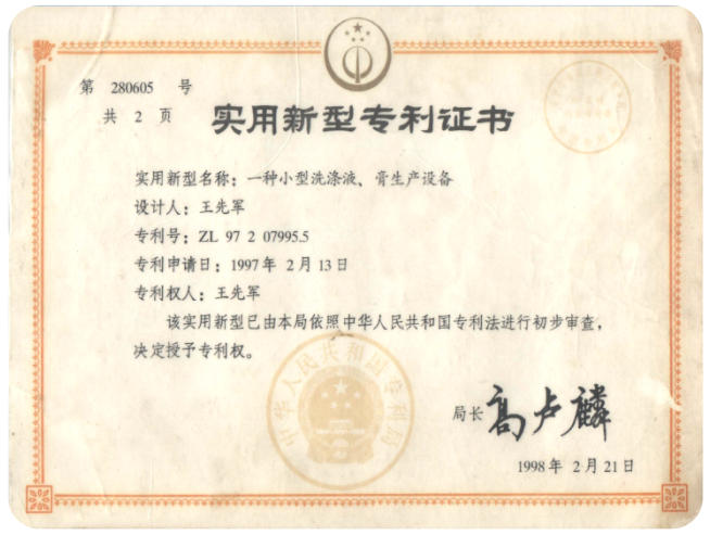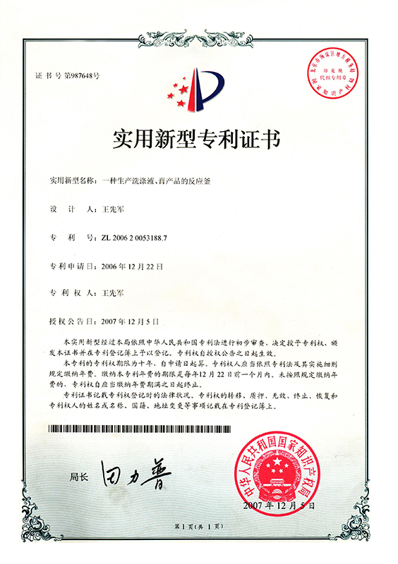 1997年2月曾獲一種小型洗滌液、膏生產(chǎn)設(shè)備國(guó)家專(zhuān)利 |
