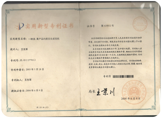2003年5月曾獲液、膏產(chǎn)品均質(zhì)乳化機(jī)國(guó)家專(zhuān)利 |