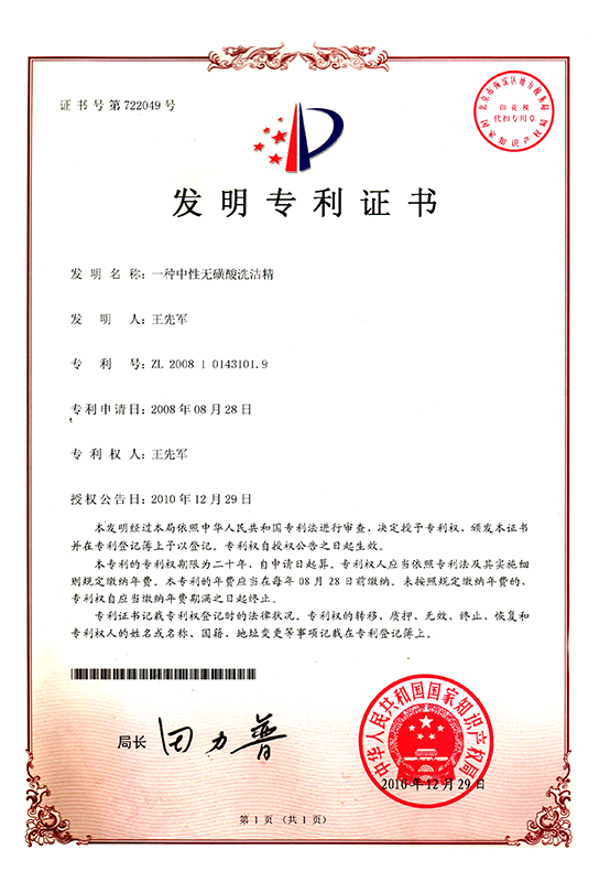 2008年08月曾獲得液體洗滌劑技術(shù)發(fā)明專(zhuān)利 |