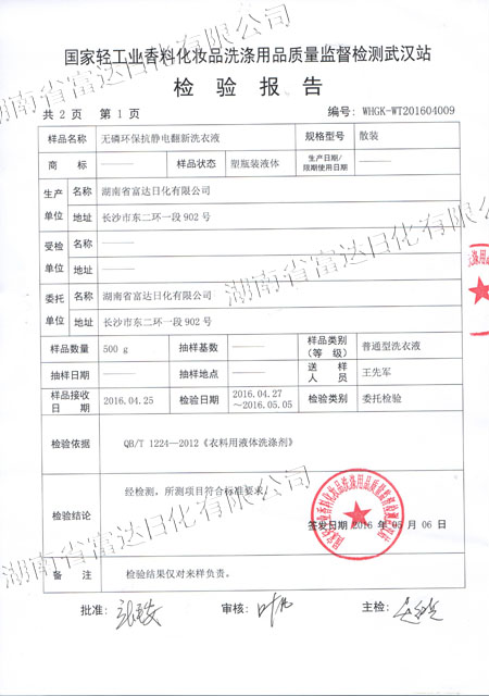 多項(xiàng)專利發(fā)明人王先軍 手機(jī):150-7483-5702 手機(jī):195-7316-02882016年4月,富達(dá)日化用戶周先生反饋: 在周先生銷售洗衣液、洗滌劑的周邊,有一種翻新洗衣液很走俏,他想加盟,可加盟門檻很高,問(wèn)公司能否生研發(fā)生產(chǎn)出類似的產(chǎn)品。收到客戶的反饋后,作為多項(xiàng)專利的發(fā)明人,早在10年前就根據(jù)氧化還原反應(yīng)原理研究過(guò)衣物翻新洗衣液。經(jīng)過(guò)2個(gè)多月的研發(fā),無(wú)磷環(huán)??轨o電衣物翻新洗衣液按照國(guó)家標(biāo)準(zhǔn)研發(fā)成功,并送檢國(guó)家輕工業(yè)質(zhì)量監(jiān)督檢測(cè)武漢站,于5月下旬通過(guò)環(huán)評(píng)檢測(cè)。