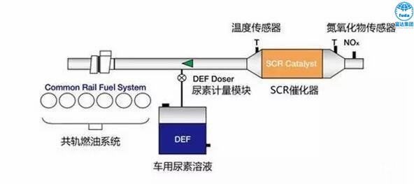 SCR系統(tǒng)包括尿素罐(裝車用尿素溶液)、SCR催化反應罐。SCR系統(tǒng)的運行過程是:當發(fā)現排氣管中有氮氧化物時,尿素罐自動噴出車用尿素溶液,尿素溶液和氮氧化物在SCR催化反應罐中發(fā)生氧化還原反應,生成無污染的氮氣和水蒸氣排出。